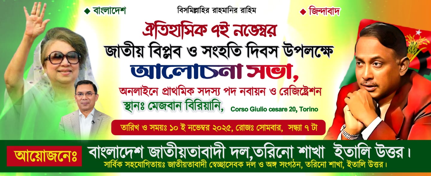 ঐতিহাসিক ৭ই নভেম্বর জাতীয় বিপ্লব ও সংহতি দিবস উপলক্ষে তুরিন বিএনপির নেতৃবৃন্দের আয়োজনে আলোচনা সভা ও অনলাইনে দলের প্রাথমিক সদস্যপদ নবায়ন কার্যক্রমেরও আয়োজন করা হয়েছে।