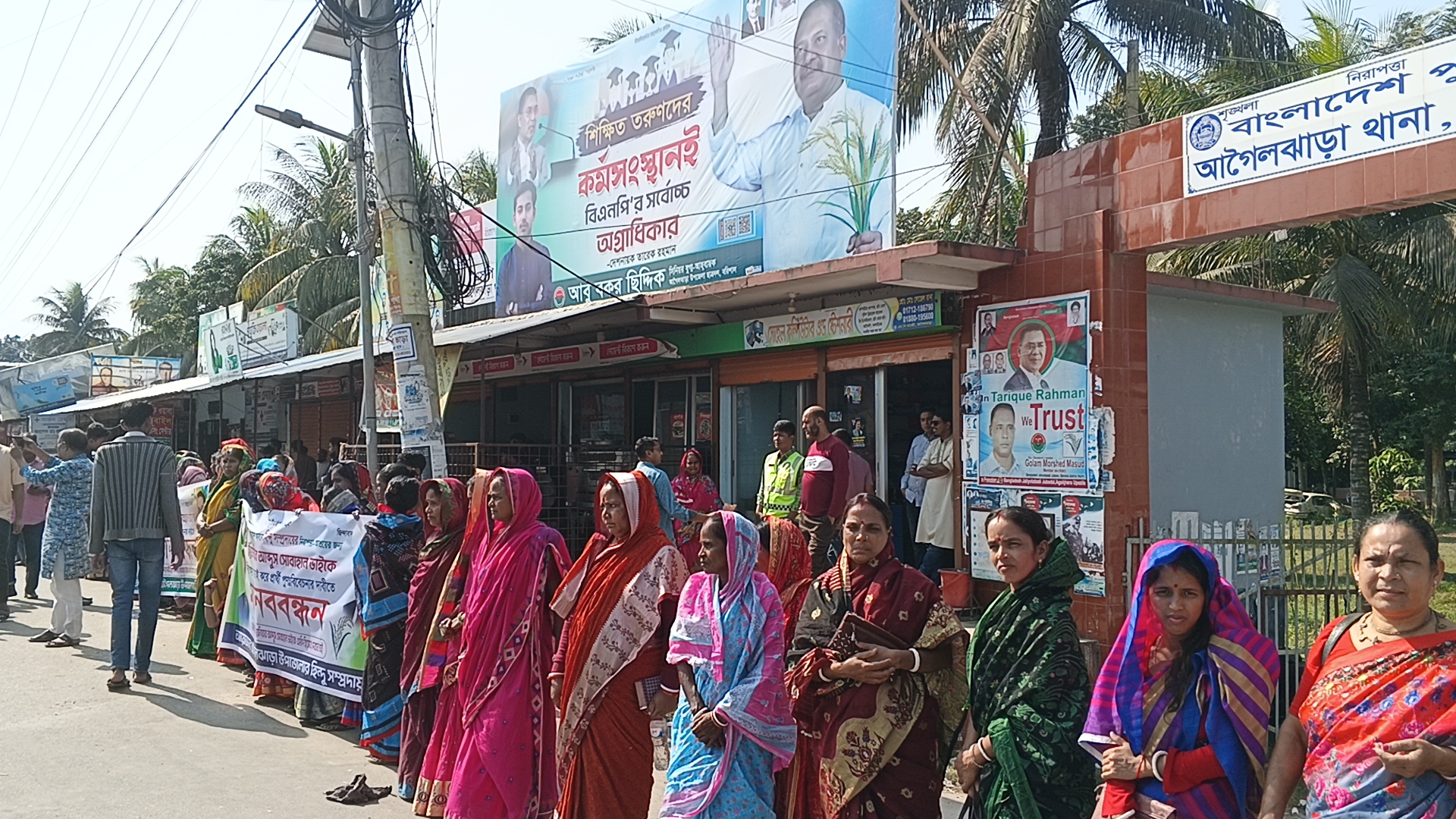 শনিবার সকালে ১১ টায় আগৈলঝাড়া থানার সামনে মানববন্ধন এবং উপজেলা চত্বরে এ প্রতিবাদ অনুষ্ঠিত হয়। বিভিন্ন মন্দির কমিটি, পূজা উদযাপন পরিষদ এবং স্থানীয় সংখ্যালঘু নাগরিকদের ব্যানার-ফেস্টুন নিয়ে ঘন্টাব্যাপী মানববন্ধনে অংশ নিতে দেখা যায় নারী-পুরুষসহ সকল শ্রেণিপেশার মানুষকে।