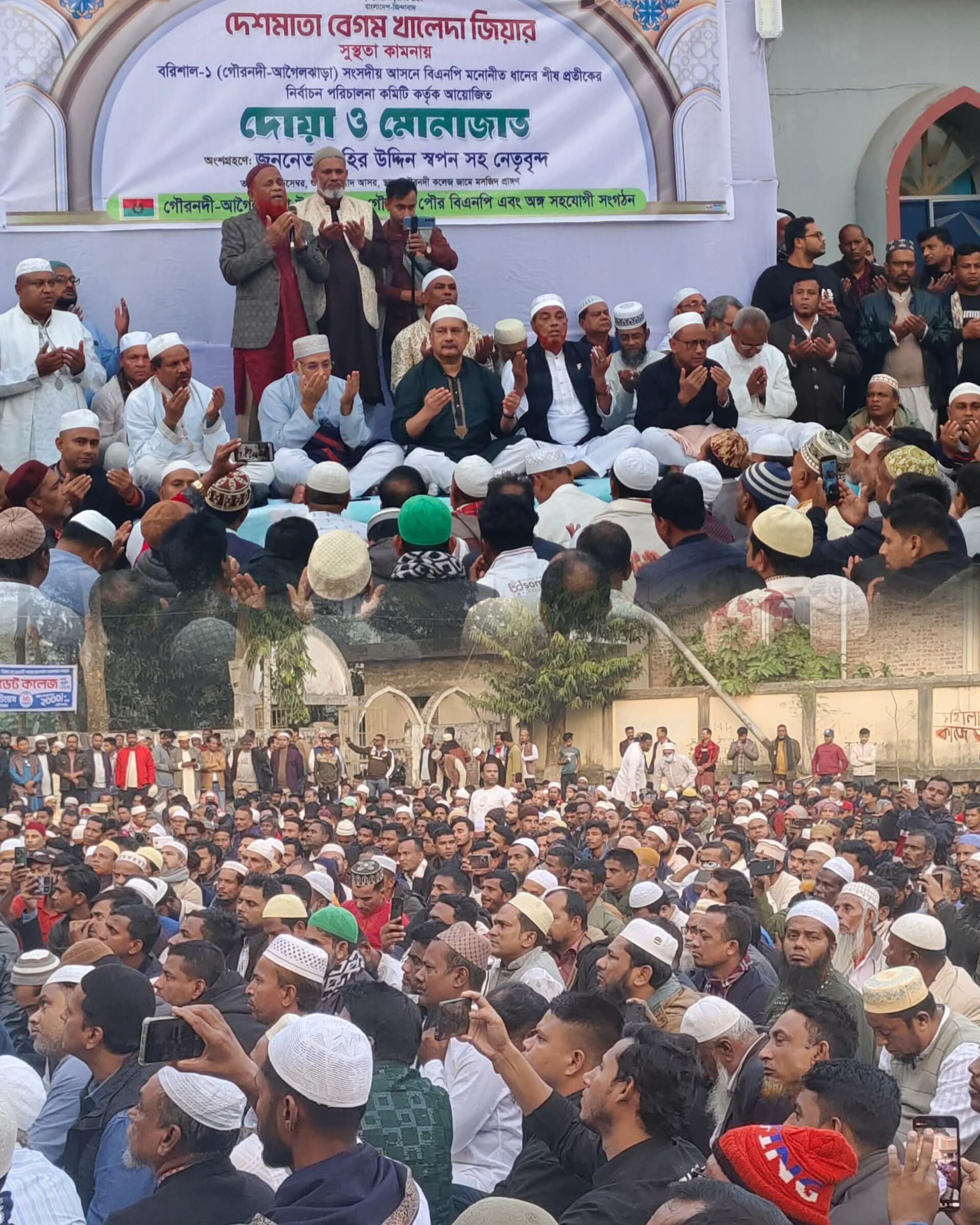 বরিশাল–১ (গৌরনদী–আগৈলঝাড়া) আসনে বিএনপি মনোনীত ধানের শীষ প্রতীকের নির্বাচন পরিচালনা কমিটির উদ্যোগে দেশমাতা, তিনবারের সাবেক প্রধানমন্ত্রী ও বিএনপি চেয়ারপারসন বেগম খালেদা জিয়ার সুস্থতা কামনায় এক দোয়া ও মোনাজাত অনুষ্ঠিত হয়েছে।