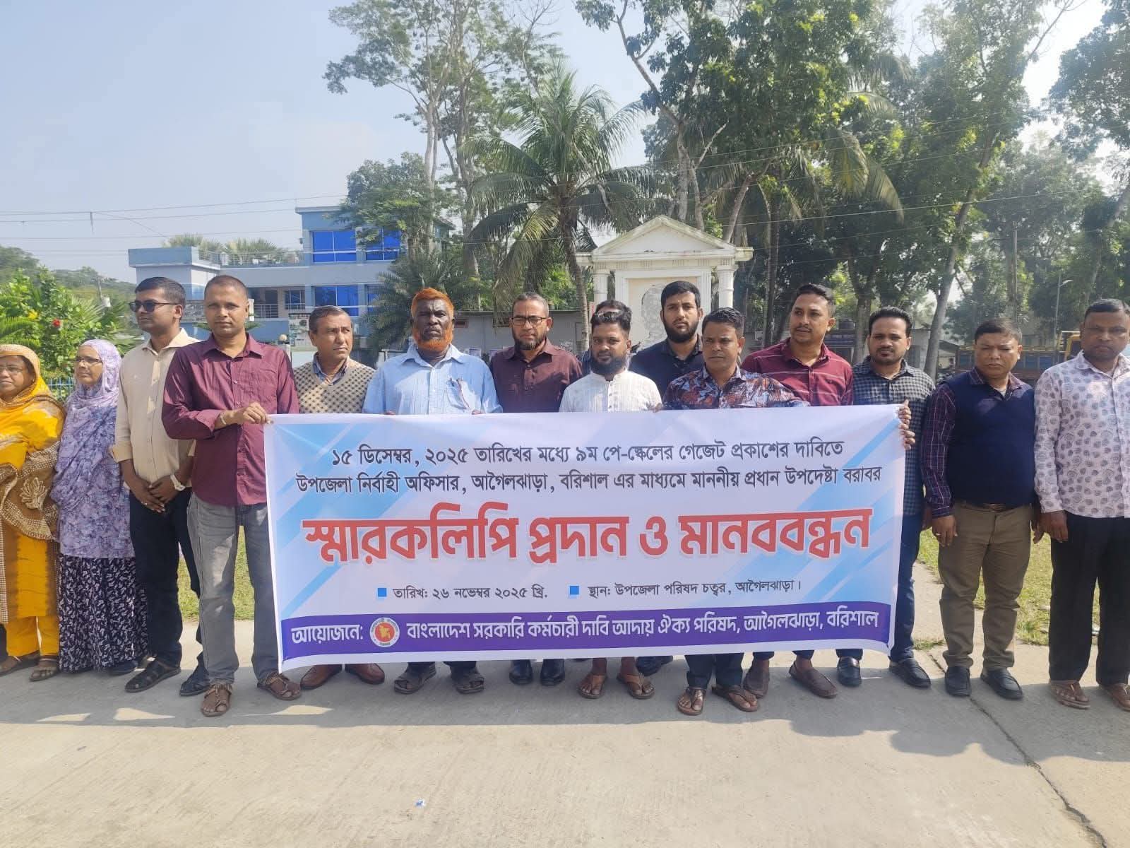 আগৈলঝাড়ায় ৯ম পে–স্কেল গেজেট প্রকাশের দাবিতে কর্মচারীদের মানববন্ধন